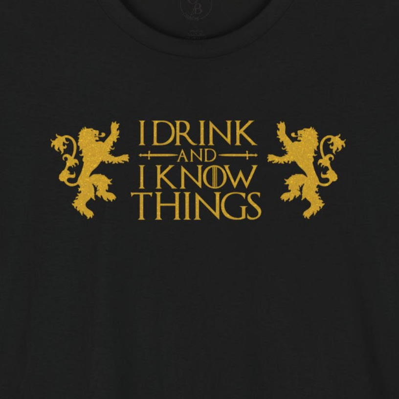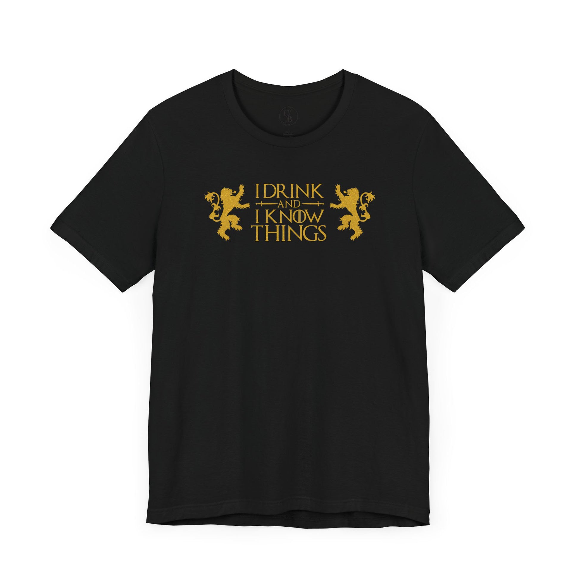 Rule the realm of fashion with this Tyrion-inspired unisex tee! Featuring the iconic "I Drink and I Know Things" quote printed in luxurious gold metal flake infused ink that catches the light like Lannister gold. Perfect for showing off your fandom while enjoying your favorite beverage. This short sleeve shirt isn't just clever—it sparkles with wit almost as much as you do!