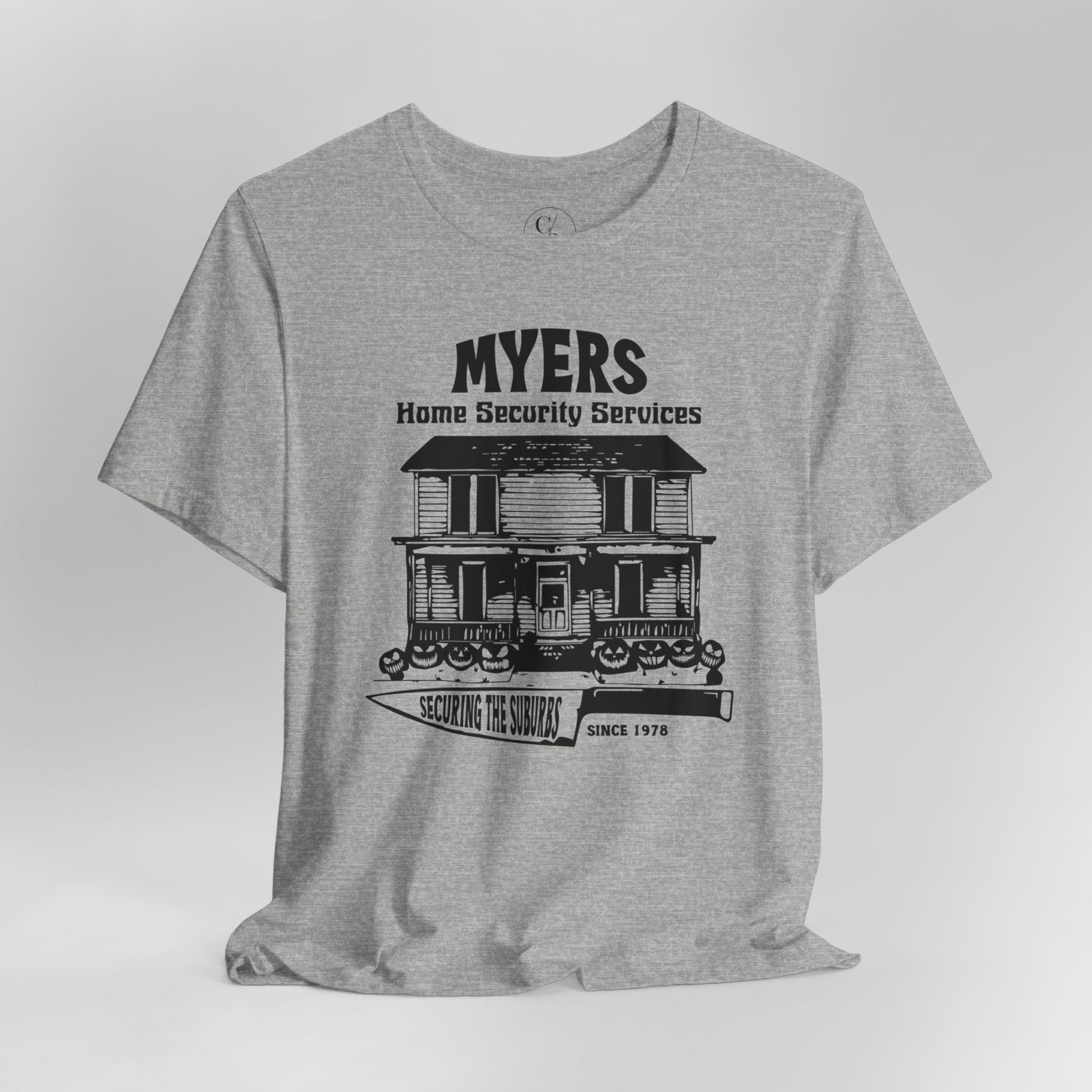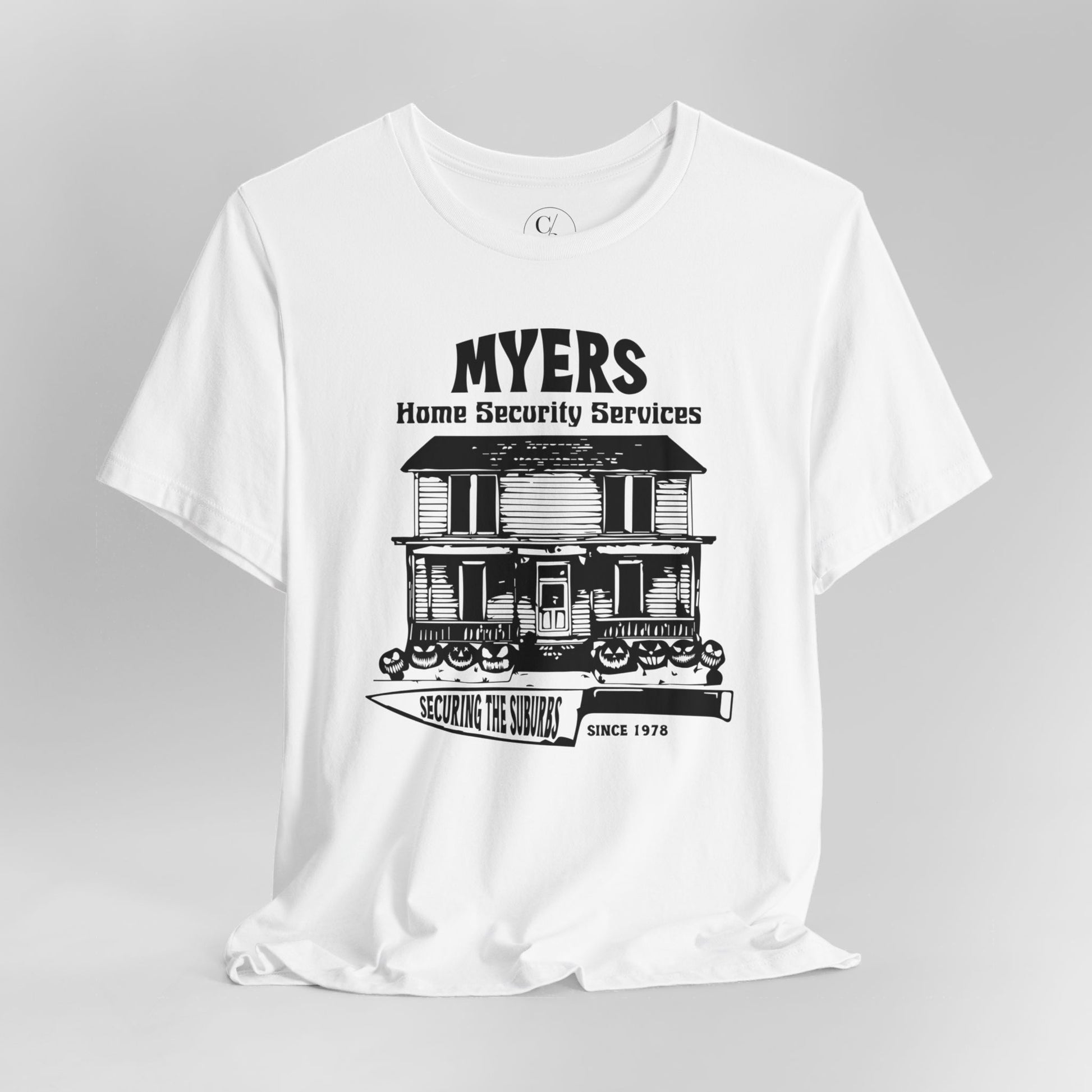 Get ready to slay Halloween (and any other day) with our killer Myers Home Security Services tee! This soft and stylish shirt will make a statement that can't be beat (just like our home security services). Perfect for adding some vintage flair to your wardrobe.